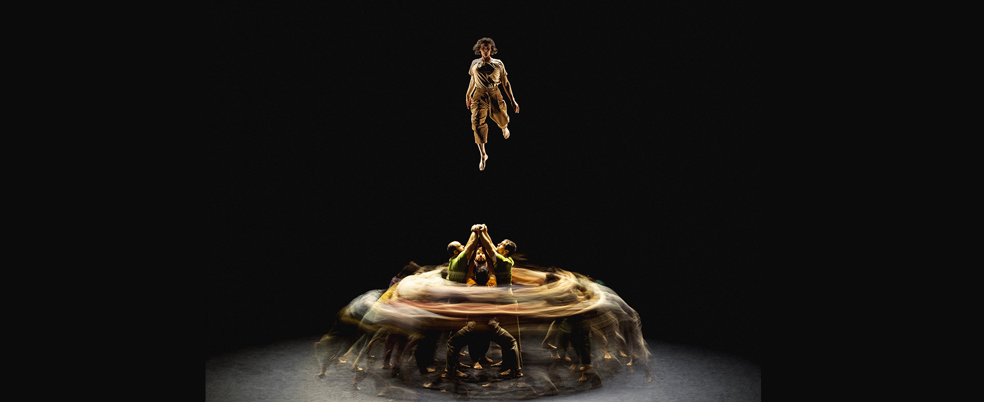 Après Möbius, qui rejouait la mystérieuse partition des étourneaux volant par centaines en un ballet réglé, le collectif questionne aujourd’hui notre rapport au vivant et à la mesure du temps. Portés et voltiges traduisent et mêlent ainsi deux temporalités : celle d’une nature dont le rythme nous dépasse ; celle d’une vie humaine et de ses émotions. Quel est le temps d’une montagne, d’une forêt, d’une rivière ? Comment le figurer et le représenter à la mesure d’une vie ? Le Pas du Monde forme, transforme et déforme les colonnes humaines des acrobates, qui peuvent passer imperceptiblement d’une posture à une autre, à l’image de l’érosion lente d’un sommet, comme se projeter dans des transformations soudaines, les pyramides de corps-cailloux chutant en éboulis. Un dispositif sophistiqué associe lumière, voix, sons et souffles pour dessiner des paysages oniriques.