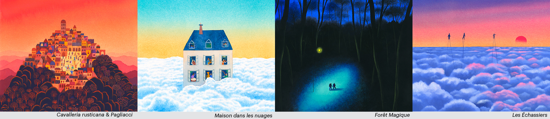 Pour plonger dans son univers coloré et onirique, une exposition de ses œuvres sera proposée au public* à partir de la Première de l’opéra Cavalleria rusticana et Pagliacci.