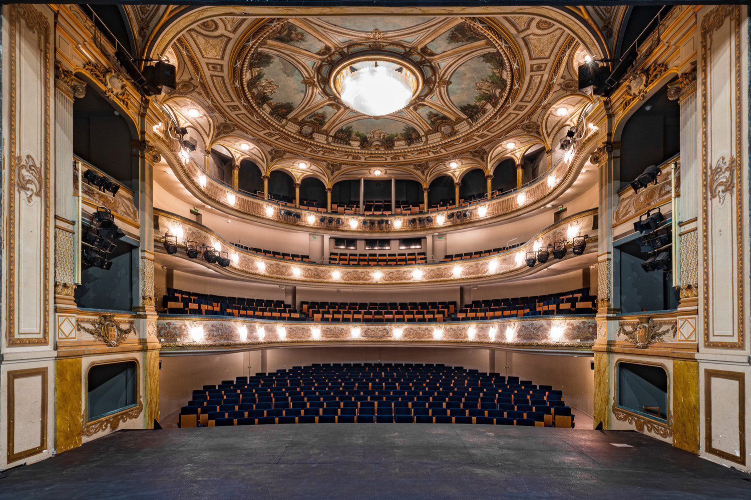 The Theatre measures 61m in length, 22m in width and about 17m in height. It boasts a semi-circular Italian-style hall, with 3 levels of galleries and proscenium boxes. It benefits from modern equipment: climate control system, automatic fire detection by electronic eye, sound reinforcement and closed-circuit television … It holds 692 seats.